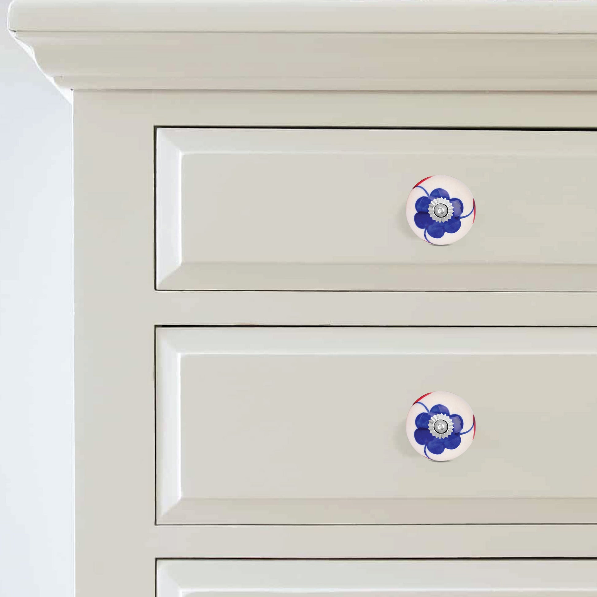 Blue Floral with Red Leaves Hand-Painted Ceramic Drawer Knob | The Indian Aura