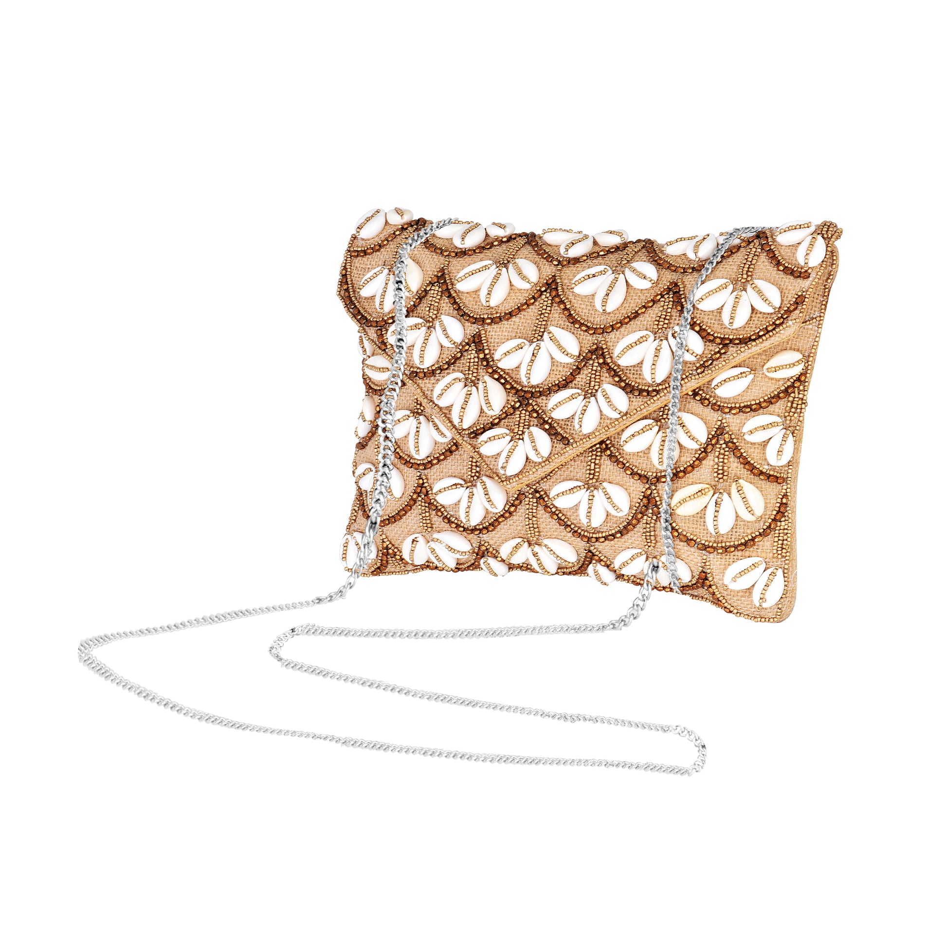 Handmade Golden Beaded Sling Bag with Heavy Shell Detailing | The Indian Aura